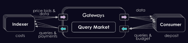 Graph 的核心目的是为用户提供查询服务。在一个简化的场景中,该协议涉及多个索引器(数据卖家)、消费者(数据买家)和网关。当客户向多个网关之一发送查询时,网关会根据索引器的出价、服务质量 (QoS)、延迟等各种因素在索引器之间分发查询。索引器通过提供查询来赚钱,同时可以自由控制他们所服务的查询的价格。这个过程如下图所示: