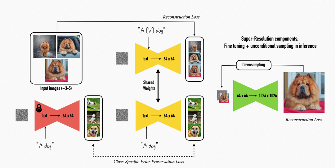 - 使用包含特殊字符和 class 的 prompt(例子:”a [identifier] [class noun]”。其中 identifier 表示稀有字符,模型没有该字符的先验知识,否则该字符容易在模型先验和新注入概念产生混淆;class noun是对 subject 粗力度类的描述,通过将稀有字符和class绑定,模型可以将class的先验和identifier绑定。对低分辨率的text-to-image模型微调,其中在少数数据上对模型微调容易产生“overfitting and language drift”问题,为此提出了class-specific prior preservation loss。使用prompt(A [class noun])在模型fine-tune之前产生的输出结果与当前模型在prompt(a [identifier] [class noun])输出的结果做正则,从而保证 class 类的先验。