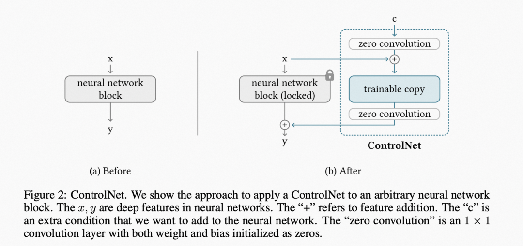 即使数据量很少(不超过5万),模型经过训练后条件控制生成的效果也很好。“锁定模型”和“可训练副本”通过一个1×1的卷积层连接,名叫“0卷积层”。0卷积层的权重和偏置初始化为0,这样在训练时速度会非常快,接近微调扩散模型的速度。