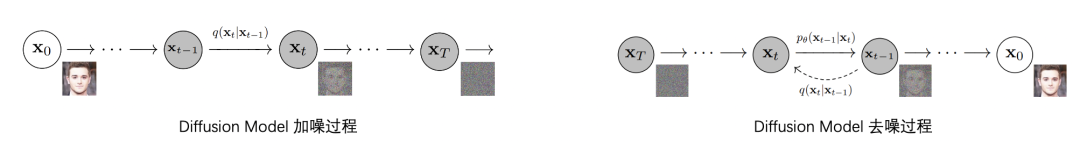 - 加噪:沿着扩散的马尔可夫链过程,逐渐向图像中添加随机噪声;