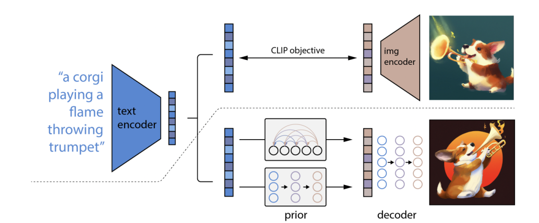 通过带条件引导的扩散模型学习文本特征到图像特征的映射,并对图像特征进行解码得到最终图像。DALLE-2 使用 CLIP 对文本进行编码,并使用扩散模型学习一个先验(prior)过程,得到文本特征到图像特征的一个映射;最后学习一个反转 CLIP 的过程,将图像特征解码成最终的图像。