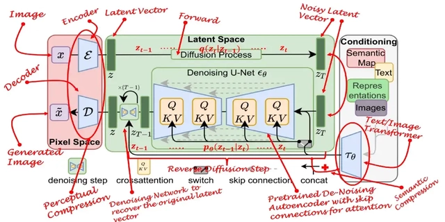 核心:潜空间的引入,替换了原先直接在像素空间的去噪过程。