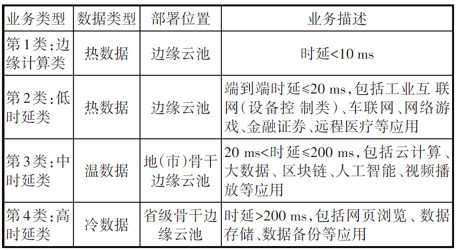 随着5G、物联网、云计算、边缘计算、人工智能、区块链等新一代信息通信技术在行业的广泛应用,亟需基于多样性算力构建新型信息通信基础设施平台的坚实底座,以满足广泛应用和海量数据的算力需求。不同业务类型对时延的需求可分为4类:边缘计算类、低时延类、中时延类和高时延类,时延越低,结合算力资源与网络优势,运营商能发展的算力业务就越多。不同类型业务需求如表1所示。