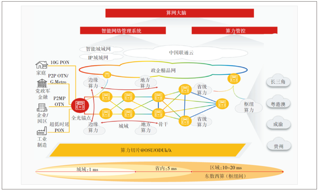 b) 省内一体光网:OXC/ROADM打造省级算力节点间全光互联,打造各本地网算力网关到就近省级算力节点5ms的时延圈,网络可持续向400G演进,实现绿色节能。