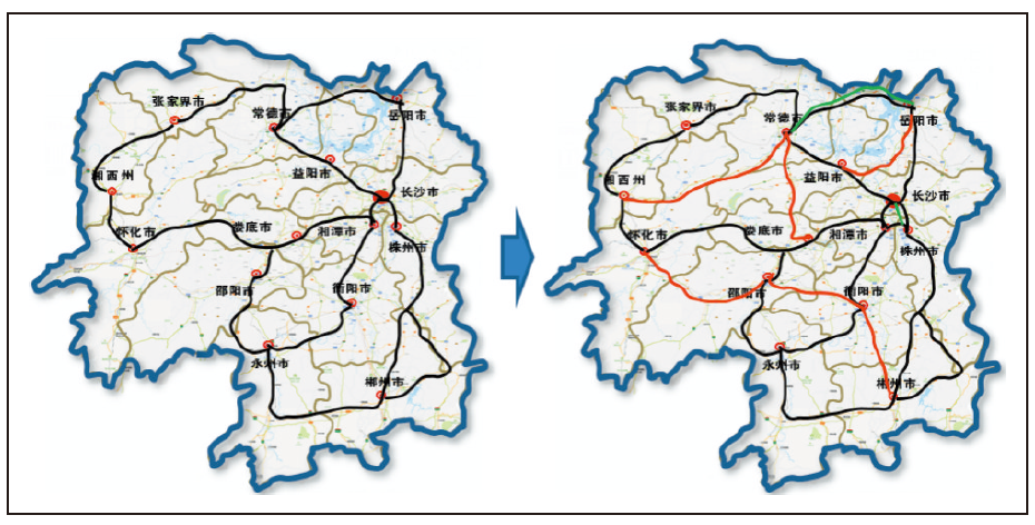 a)省干传输系统。通过对现有省干传输系统的优化改造,实现“双平面、双节点”网络架构,进一步提升业务承载安全性。结合基础架构节点演进,打造基于OXC的长株潭超低时延圈。未来还将结合省干光缆网Mesh化覆盖,实现省会OXC+地(市)ROADM的大带宽、低时延、高可用省干传输系统。随着省干光缆网在高速公路的逐步敷设完善,地(市)至省会、地(市)至地(市)路由将更为丰富,未来也将具备省会OXC+地(市)ROADM的组网架构,对比现网环网结构,业务路径可实现时延最优,波道资源利用率更高,业务安全性也将进一步提升。