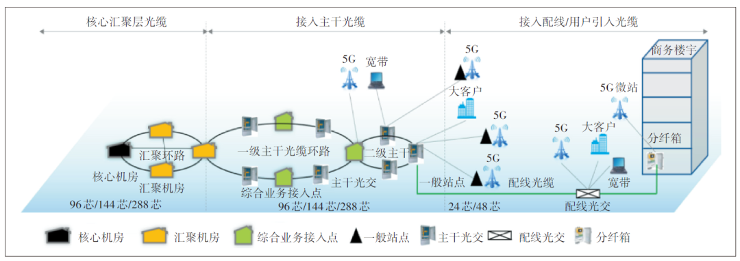 c)本地网光缆。根据算力规划布局,未来将实现“一县一DC”布局,边缘算力根据需求下沉至边缘云池,甚至客户机房内。通过部署全光锚点实现用户算力的就近接入,实现城市内用户到算力网关的一跳直达。本地网内应提前进行光缆网资源储备,以满足算力的就近接入。核心汇聚层光缆保持架构稳定,结合高速公路走向,逐步向Mesh化演进,丰富光缆路由,提升网络健壮性、降低业务时延;接入主干层光缆,提升光缆容量,向下延伸覆盖,密集城区,加大二级主干光缆建设,提升覆盖密度,提升出局纤芯容量;接入配线层光缆,增加接入节点密度,将一般站点、配线光交、楼宇分纤箱作为5G/大客户/家宽业务接入点,将业务接入距离缩短至500m以内。本地网光缆架构如图3所示。