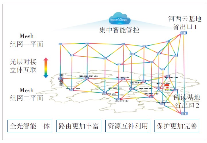 构筑一体化OTN全光网络,将DC中心和扁平化的全光省干实现ROADM/OXC光层互连,取消本地转接,减少传输成本,实现DC与DC之间,DC与传统网络之间光层一跳直达,降低了传输时延,提升业务传输效率。
