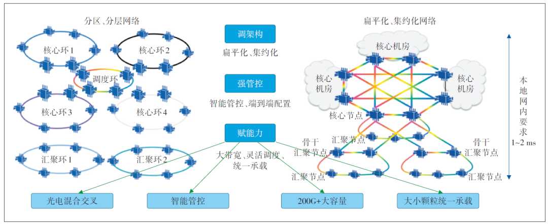 a) 网络架构:传统网络主要以行政区域分层次组网,本地网有核心层、汇聚层和接入层3个层次,以环形和链型为主,难以适应东西向流量增长的需求。