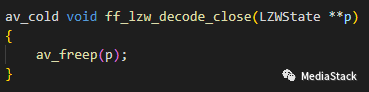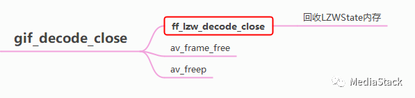 首先,获取GifState结构体指针s,该指针保存了解码器的状态信息。然后,调用ff_lzw_decode_close函数关闭LZW解压器,释放解压器所占用的内存。接着,使用av_frame_free函数释放s->frame指向的AVFrame结构体所占用的内存。最后,使用av_freep函数释放s->idx_line和s->stored_img指向的内存块,这些内存块分别用于存储解码器的中间结果和已经解码的图像数据。