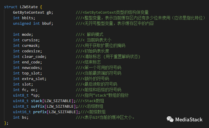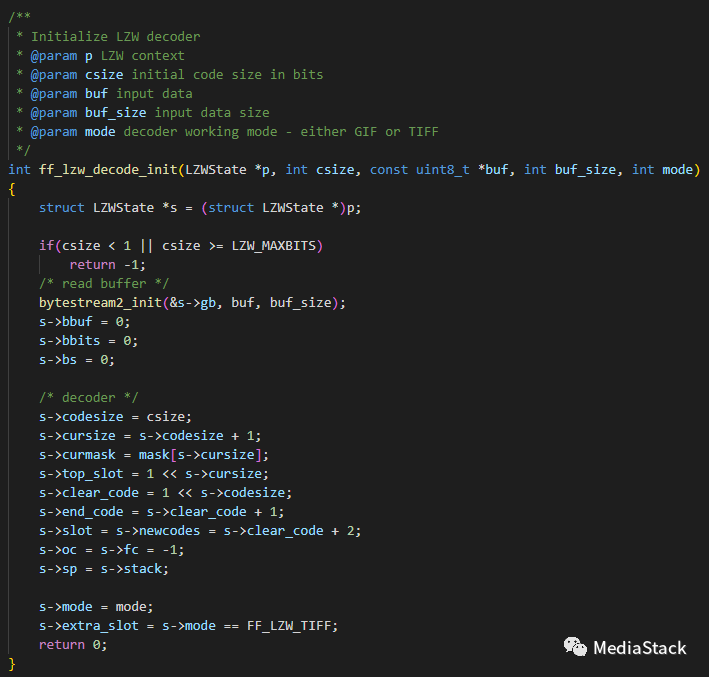 总体来说,这段代码的作用是为GIF解码器的解码过程做好必要的准备工作,包括变量和数据结构的初始化、像素格式的设置和LZW解压器的初始化。