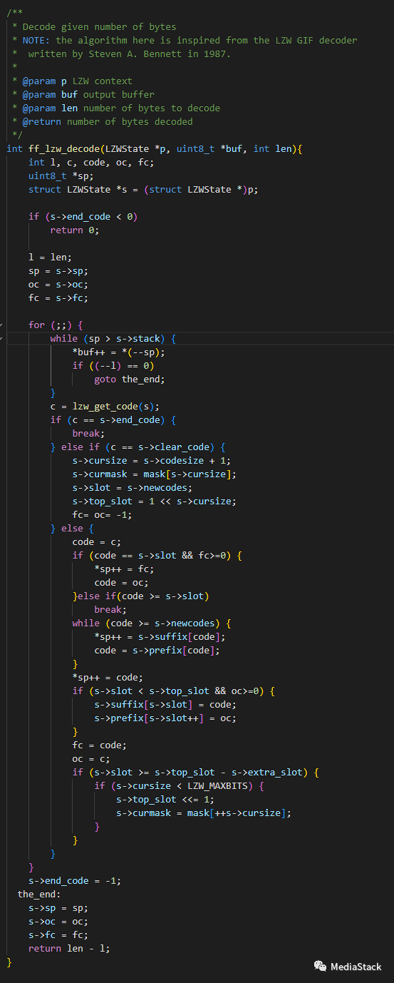该函数中使用的算法受 Steven A. Bennett 在 1987 年编写的 LZW GIF 解码器的启发。函数开始初始化一些变量,包括输出缓冲区的长度、当前和旧的编码值以及第一个和旧的字符。