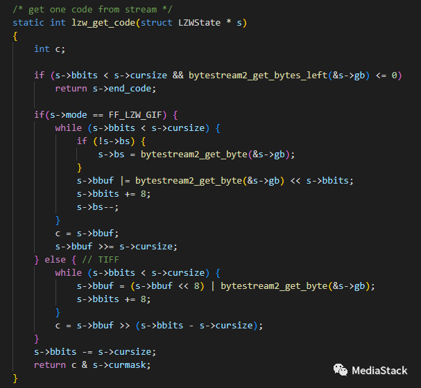 这段代码实现了从流中获取一个编码的功能。该函数接受一个 LZW 状态结构体,返回从流中读取的编码。