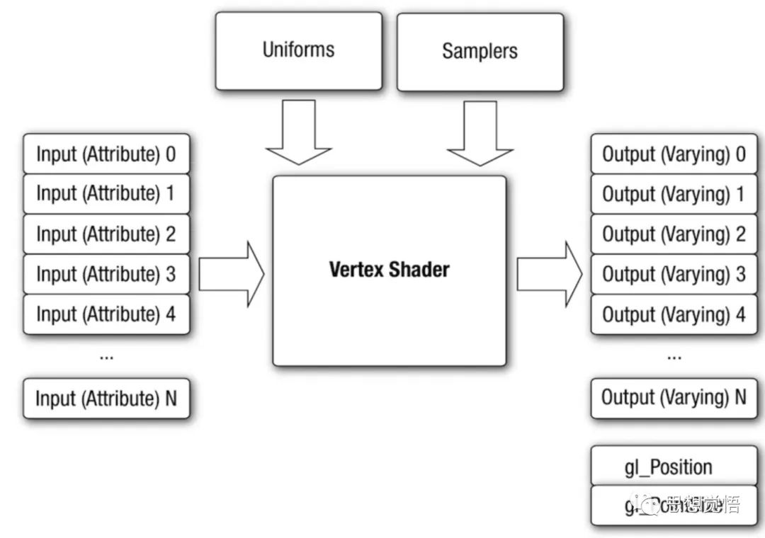 顶点着色器负责的功能是把输入的数据进行各种计算,⽣成/变换纹理坐标,并且把位置和纹理坐标这样的参数发送到片段着色器。