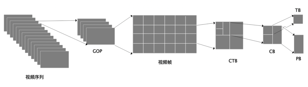 从编码顺序和结构上讲,H.265首先将一个视频划分成若干个序列,一个序列划分成若干个图像组(GOP),每一个GOP代表一组连续的视频帧。H.265 在对图像做预测编码和变换编码时,会先对图像进行划分,划分方式是四叉树。在划分四叉树时,会将整个视频帧划分成若干个正方形的编码树块(CTB),CTB 可以继续划分成编码块(CB),CB 还可以划分为预测块(PB)和变换块(TB)。因此,H.265对视频的结构划分如下图所示: