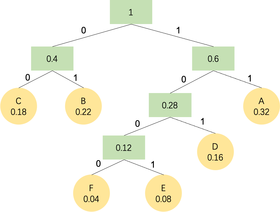 左节点的路径为0,右节点的路径为1,求得A、B、C、D、E、F的编码结果: