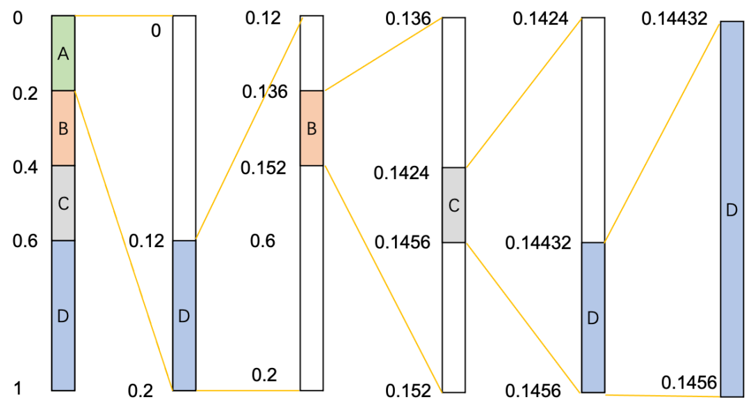 得到最后的[low, high)区间是[0.14432, 0.1456),在这个区间内取任意值转二进制后都是对 “ADBCD”的算术编码。对应的编码流程可以简化到下面这张图中: