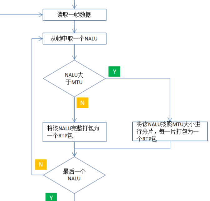 - 然后遍历H264的所有NALU:如果NALU长度小于MTU,则将该NALU打包为一个RTP包;否则,将NALU按照MTU大小进行分片(本文只用FU-A分片格式)。