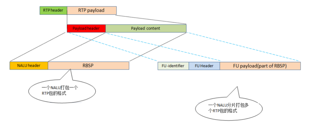 上图展示了如何将一个NALU打包到RTP的payload;上图的左边的打包流程对应的场景是“NALU的长度 <= MTU”,直接将NALU的header拷贝到H264 RTP Payload Header上,将NALU的RBSP拷贝到H264 RTP Payload Content上。