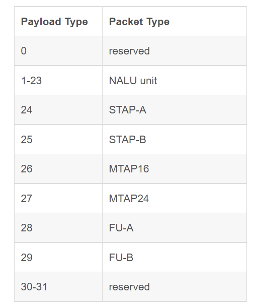 上图右边的打包流程对应的场景是“NALU的长度 > MTU”,要将NALU的RBSP进行分片,以保证打包后的RTP报文长度不大于MTU,H264 RTP Payload Header由FU-identity + FU Header组成;FU-identity字段和NALU header字段的格式一样(如果不一样的话,接收端就搞不清这是一个NALU分片还是一整个NALU了),其最低的5bits表示payload的类型(不同的取值表示RTP的类型不同,见下表);FU payload就是NALU的RBSP(一部分);另外,属于同一H264帧的所有RTP头的时间戳都要打成相同的,接收端根据时间戳来判断哪些包是属于同一个H264帧的。