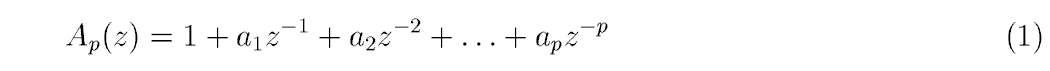 接着我们定义两个与A(z)相关的p+1阶的多项式P(z)和Q(z),这两个多项式表示人类声道的互连管模型,A(z)是它们的线性组合,即: