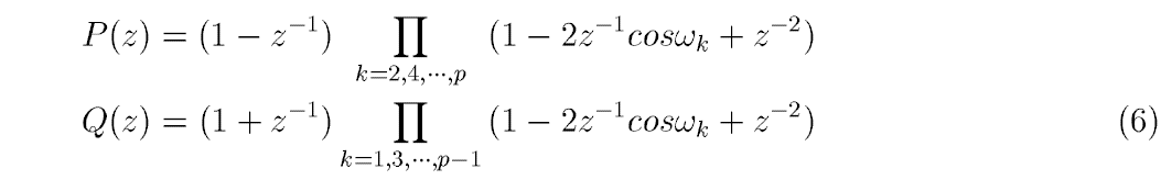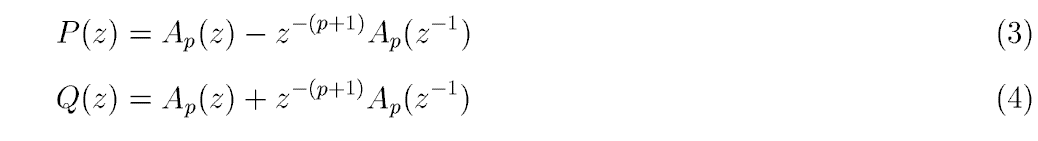 相应的,如果我们知道了线谱频率,可以构造两个多项式如下所示,然后将其代入公式(2)中,就可以得到LPC系数了。