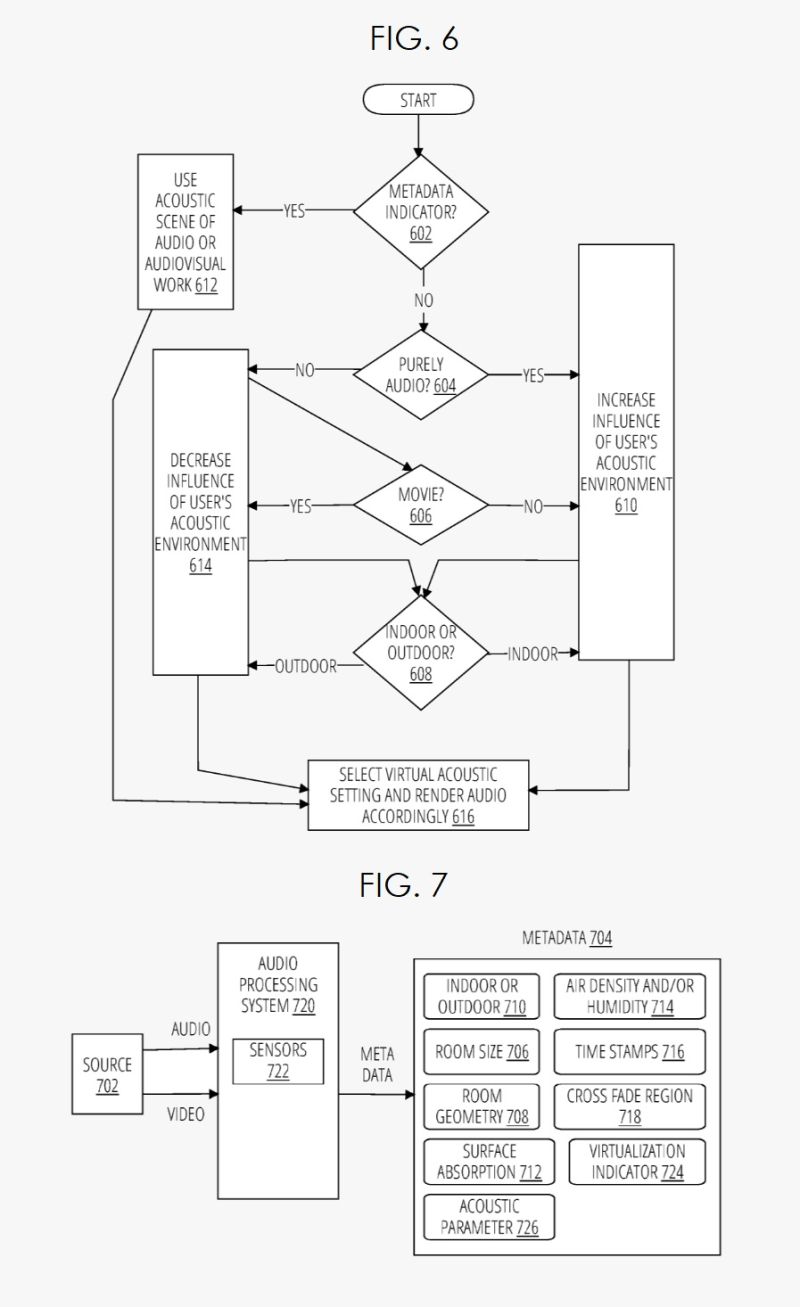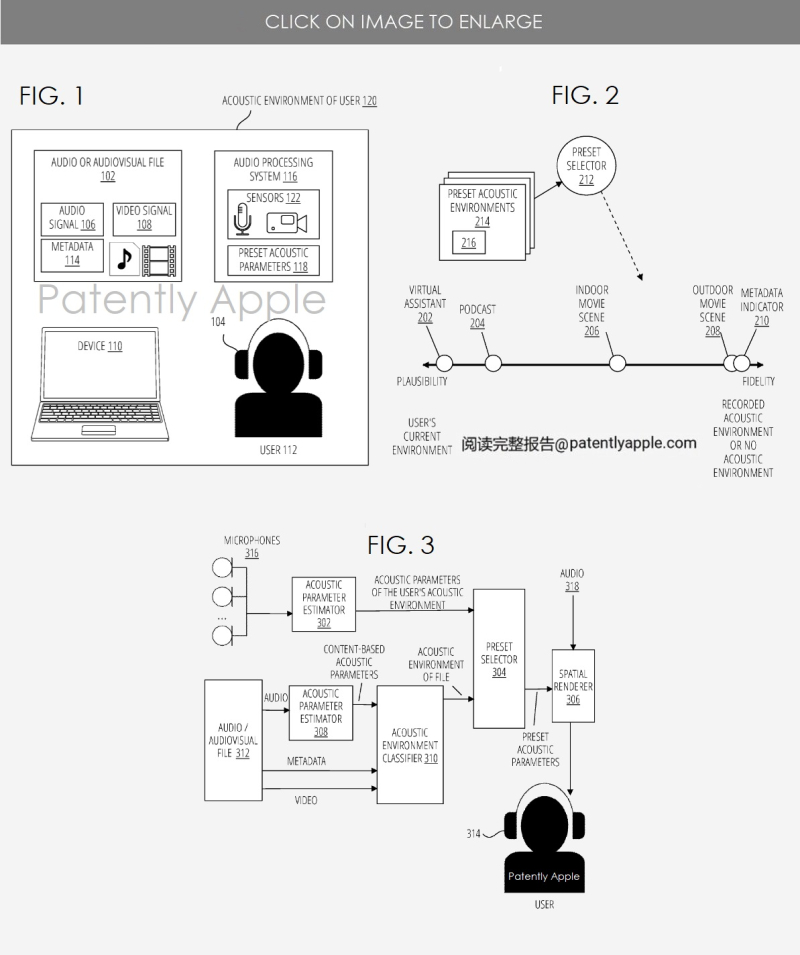 Apple 在开始其专利申请时指出,内容创作者可以创作音频或视听作品。可以根据内容创建者的口味对音频进行精确微调,以便向听众提供特定的体验。内容创建者可以制作音频,使其带有特定场景的可感知提示,例如,回声室外山坡、体育场或小型封闭空间。在室外录制的音频作品可能具有可感知的声学线索,将听众传送到室外环境。类似地,如果音频作品是在一个房间里录制的,那么听众可能会被虚拟地传送到房间里。