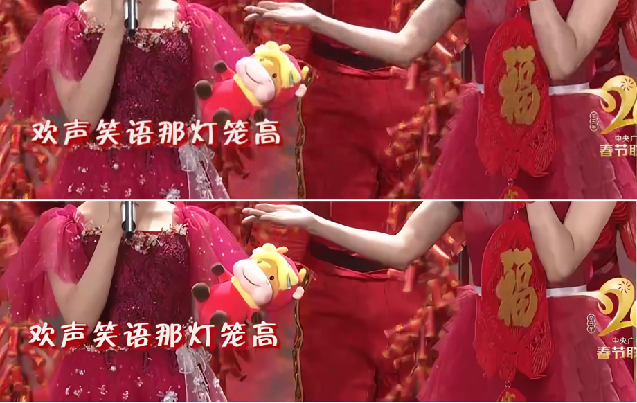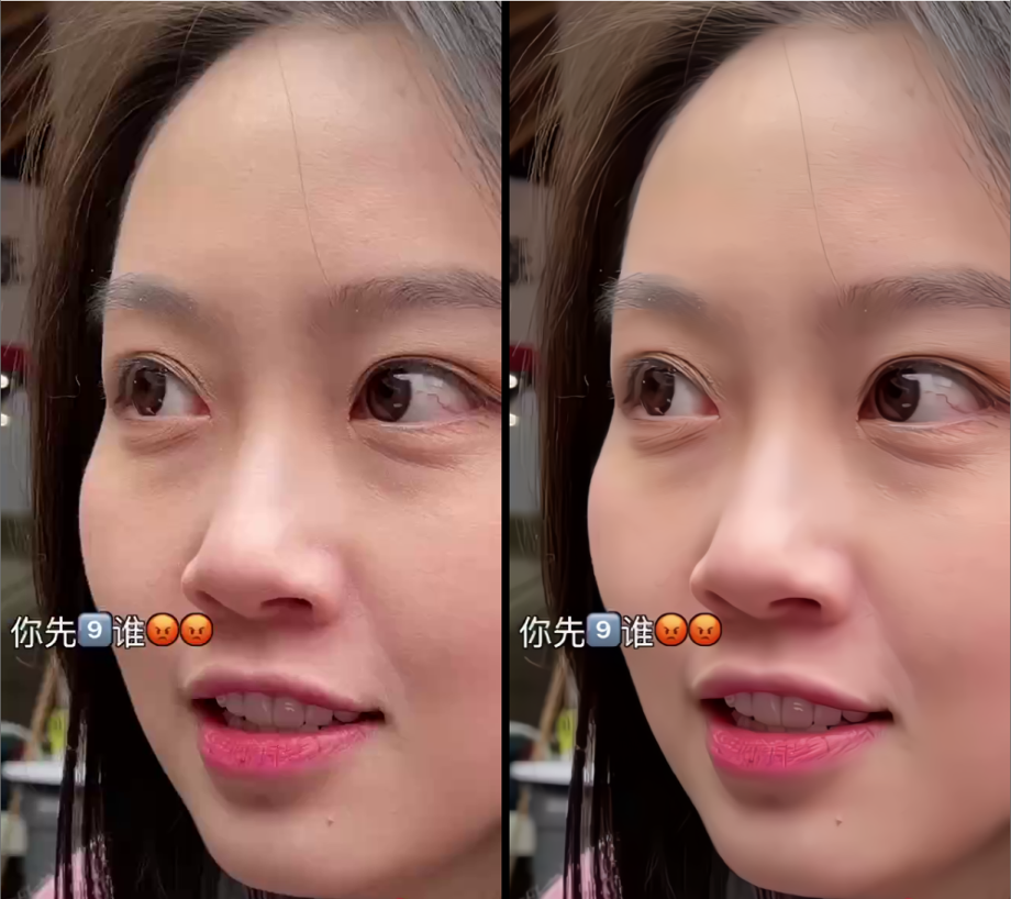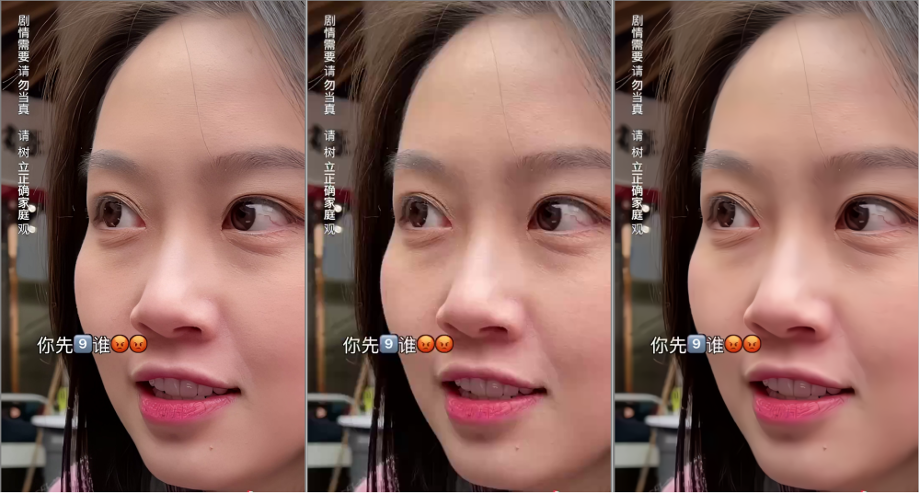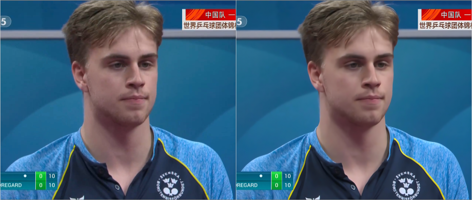 处理之后编码artifacts被有效去除,画面比较干净平滑,但缺少细节和质感,例如:人像区域的头发/眉毛/胡子/皮肤颗粒感/嘴唇纹理等细节;地面草地纹理细节以及晚会节目视频中演员服装、道具细节丢失。
