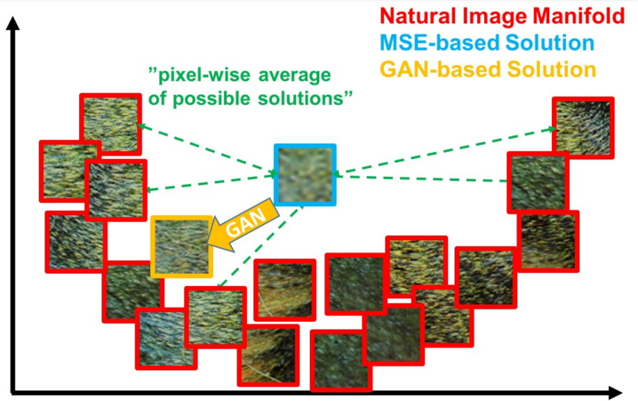 如下图所示,基于MSE的模型倾向输出平滑的结果,而基于GAN的模型倾向输出有一定纹理细节的结果。