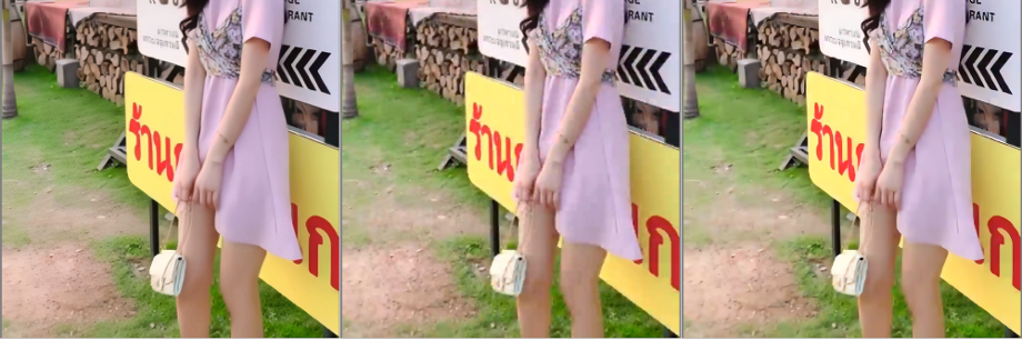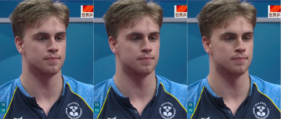 回到前面提及的几个常规CNN处理效果例子,我们再来看看使用窄带高清GAN细节生成处理会有怎样不一样的结果。对于这些例子,我们使用通用场景模型进行处理,从左至右分别为:窄带高清GAN处理、输入原始帧、常规CNN处理效果。