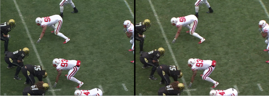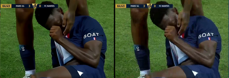 图14 头发,胡子区域有明显的细节生成,纹理更丰富在前面我们提到,针对垂直细分场景,模型会对该场景特有的目标进行较为激进的纹理生成。例如对于足球赛事场景,模型对场地的草地纹理有更强的生成能力。下图是两个示例:从左至右分别为:窄带高清GAN处理、输入原始帧。