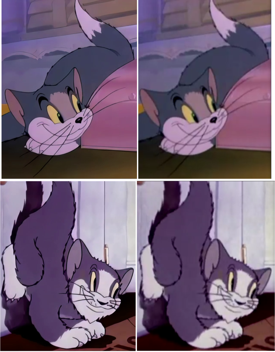图15 足球赛事场景,草地纹理生成效果此外,对于动画片场景,我们也训练了一个针对性的GAN模型,聚焦在线条生成能力。下面为三个动画片的处理效果,从左至右分别为:窄带高清GAN处理、输入原始帧。