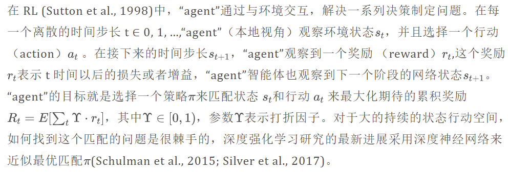 我们接下来提供 RL 的高级概述,并解释拥塞控制怎么被制定为 RL 任务。