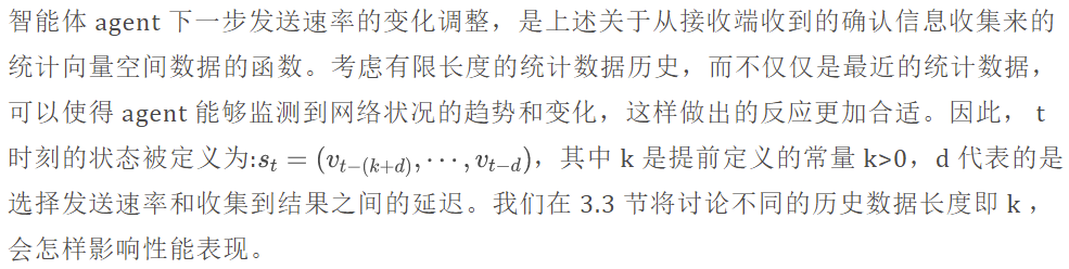状态 State 和网络状态的历史统计数据绑定。发送端在 MIt 里选择发送速率之后,将观察到在这个发送速率的后果,并且从收到的 ACKs 中计算统计空间 vt,我们把我们的统计空间限制在以下组成部分:(i)延迟梯度(Dong et al., 2018),即延迟对时间的倒数;(ii)延迟比率latency ratio (Winstein& Balakrishnan, 2013),即当前监督时间段内的延迟和观测到的历史监督段内最小的延迟的比率;(iii)发送率,即发送的数据包和确认接收的数据包的比率。