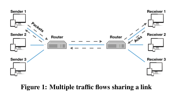 考虑图 1 的示例所描述的,多连接(也被称作“流”)共享一条通信链路。每一个连接都有一个流量发送方和一个流量接收方,发送者把数据流发送给接收端,并持续接收接收端发送的反馈信息(ACKs),并根据反馈调整发送速率。发送端调整发送速率的方法取决于连接双方采用的拥塞控制协议。不同连接的收发双方的交互产生网络动态变化,取决于相互的拥塞控制协议,链路容量(带宽),以及链路缓存大小和包排队策略,决定了哪些多余的流量被舍弃。及时是图 1 这种简单的单链路场景也描述了拥塞控制的复杂性,在这个场景中,不同的连接链路选择发送速率也是不协调,难以集中调整的。通常,每一条链路都没有竞争链路的明确信息,比如数量、进出网络的次数、采用的拥塞控制协议等,或者整个网络的明确信息,比如网络带宽、缓存大小、数据包排队策略。当然,当流量通过多个链路转发时,这些挑战会加剧。