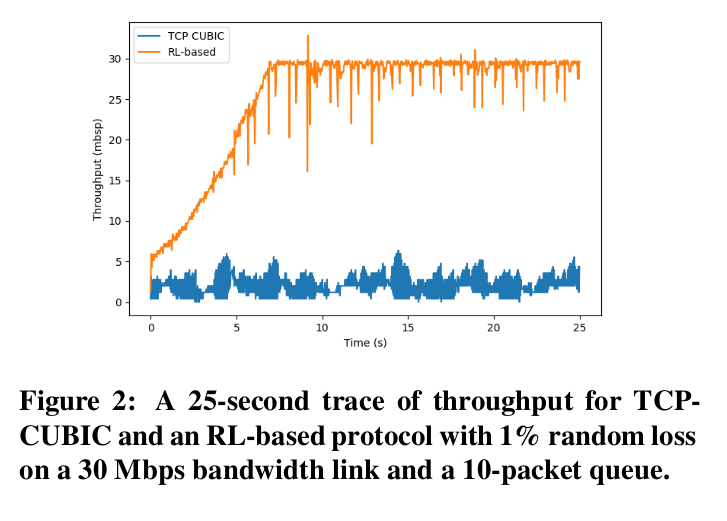 图 2 描述了一个 30 Mbps 带宽的连接上,随机 1% 的丢包,只有一条数据流的情况下,一种使用 Linux 系统默认的 CUBIC 协议,一种情况使用我们设计的 RL 框架,两种协议下链路吞吐量情况。观察到,TCP CUBIC 协议下,每当发生丢包,发送端就会将发送速率减半,这样就不能完全利用链路带宽。然而,基于 RL 的协议有效的区分两种类型的丢包。当发生随机丢包的情况下,增加发送速率,但是,当由于发送拥塞引起丢包的情况下,通过不增加速率又避免超过链路容量太多。因此,基于 RL 的拥塞控制协议能够维持较高的链路利用率。直观上来说,两种类型的丢包是能够区分出来的,因为随机丢包不是发送端行为引起的,但是拥塞丢包速率会随着发送速率增加而增加。
