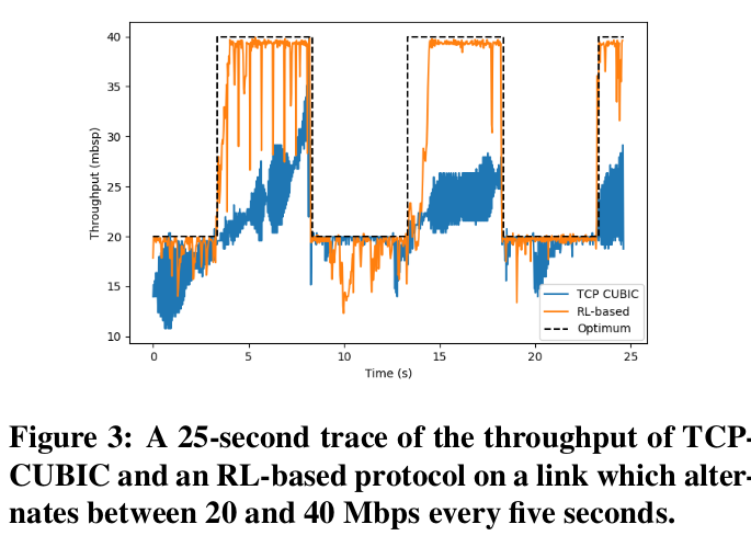 向图 3 展示的, TCP CUBIC 没有做到这一点。相比而言,基于我们 RL 框架的拥塞控制协议更接近理想的行为。直观来看,这一协议学到了网路状况的变化,例如,突然陡峭的丢包表明可用带宽下降很快,发 送速率超过 20 Mbps,并没有丢包表明可用带宽更高(40 Mbps)。