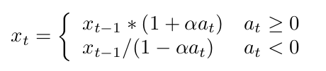 RL 的输入和输出。我们选择下面的公式作为我们 “agent” 基于第 2 节讨论的数据集产生的输出和发送速率 X t-1的变化之间的映射关系: