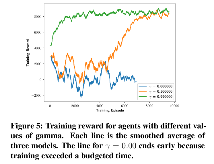 #折扣因子。我们测试了三个不同的 γ 取值,最终决定,γ = 0.09 能够快速取得最好的结果,然而当γ=0.50最终也能学到合适的策略,γ=0.00时模型学习不到有用的策略。考虑到采取行动和观察到奖励之间的间隔,这个结果看起来就很直观。图 5 展示了这一趋势。