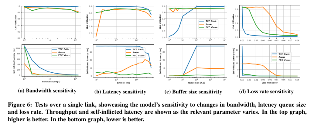 万神殿 (Pantheon) 项目表明,改变这四个链路参数足以模拟各种各样的现实网络条件。(万神殿也包括第五个参数,将队列设置为固定或者指数分布的服务时间来更好的模拟行动 LTE 链路,在 mininet 平台里没有这个参数)。我们在单条链路中单独的一个发端进行 2 分钟的测试。对于每一个测试,我们把我们模型的结果和 TCP CUBIC (当前拥塞控制的标准协议)和 PCC Vivace (Dong et al. 2018, a robust, state-of-the-art algorithm)进行比较。我们的补充材料中包括了和其他最新的算法的比较。除非另有说明,Mininet 链路配置 30 Mbps 带宽,30 ms 的延迟,1000个包排队,0%的随机丢包。#带宽变化实验。我们选取 1.2 Mbps – 6 Mbps 链路带宽训练我们的模型,但是,实际中可能在更大带宽范围内发生拥塞。在图 6a 中,我们展示了 Aurora 在 1 Mbps – 128 Mbps 之间表现很好,这一带宽范围是训练范围的20倍以上,我们在我们的标准链路配置上,为每个测试配置不同的带宽,范围从1到128 Mbps。我们的模型在所有容量下都实现了近乎完美的链路利用率,延迟远低于 TCP,与 pc – vivace 相当。#延迟变化实验。我们在 50ms – 500ms 的延迟范围训练我们的 Aurora 模型,但是很多互联网络的延迟远远低于(很少更高)这个范围。为了测试我们的模型在不同延迟的链路上的鲁棒性,我们实验选择的延迟范围是1 ms – 512 ms 。Aurora在1ms延迟时表现很差,因为我们的模拟环境包括了真实的数据包处理,这个过程会在延迟上增加大约1ms的噪声,但在训练中没有出现。#链路队列变化实验。我们在链路队列大小在 2 – 2981 个包的范围训练我们的 Aurora 模型。对这组实验来说,我们改变队列大小在 1-10000 个包。图 6c 我们的模型吞吐量和PCC-Vivace 在所有的队列长度上相当,比 TCP CUBIC 吞吐量有很大的提升。#丢包率变化实验。我们在 0% – 5% 的随机丢包率变化范围内训练 Aurora 模型,这一范围几乎覆盖了大多数互联网状况的丢包范围。但是我们还是测到8% 的丢包率范围来验证我们模型的鲁棒性。在这个测试里, Aurora 在更高的丢包情况下比其他算法提供了接近容量的吞吐量。#动态的链路变化实验。一些网络链路,特别是移动的网络链路中,信道容量取决于实时的信号强度变化,是否受到干扰、距离或者环境的影响。链路容量的确切动态变化很大,因此我们测试了一个简化的情景。在这个场景中,我们考虑链路的容量每5秒在16 Mbps – 32 Mbps 之间完全随机的选择一个值。我们让 Aurora 和五个基准机制每次实验两分钟,至少在这条动态链路上进行 5 次实验。图 7 的结果如预期所料。