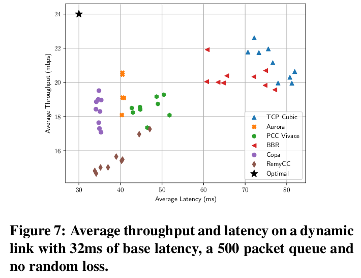 图 7 中这些方案在延迟和吞吐量之间有不同的权衡点,TCP CUBIC 以更高的时延为代价换来高吞吐量,而且在很多网络环境中有差的表现(见 Dong et al. 2015 and references therein)。Aurora取得接近 BBR 的吞吐量但是有更地的时延。最近的设计致力于降低延迟,以更好地支持小型web查询、实时视频和游戏等应用程序。在这些低时延的机制中, Aurora 比 PCC-Vivace 平均取得了更高的吞吐量和更低的时延,比 RemyCC (Winstein & Balakrishnan, 2013)在相近的时延下取得更高的吞吐量,使得 Aurora 更适合这些动态链路。最后,Aurora 性能接近 Copa ,4.2% 的更优吞吐量和 16% 更差的时延。