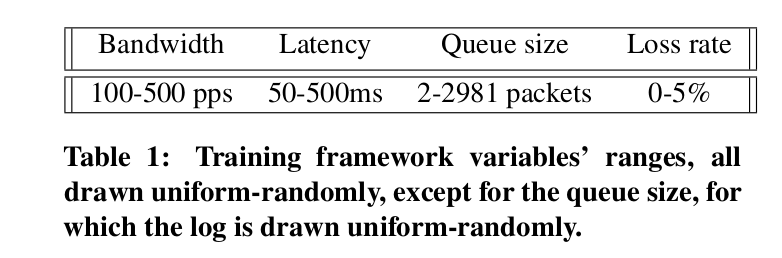 我们模拟的链路,其中队列先进先出,有万神殿中定义的四个关键参数:带宽、时延、随机丢包率和队列长度,每一个变量都和真实计算机网络中提供同样的目的。表 1 提供了在我们例子中设置的参数的范围。