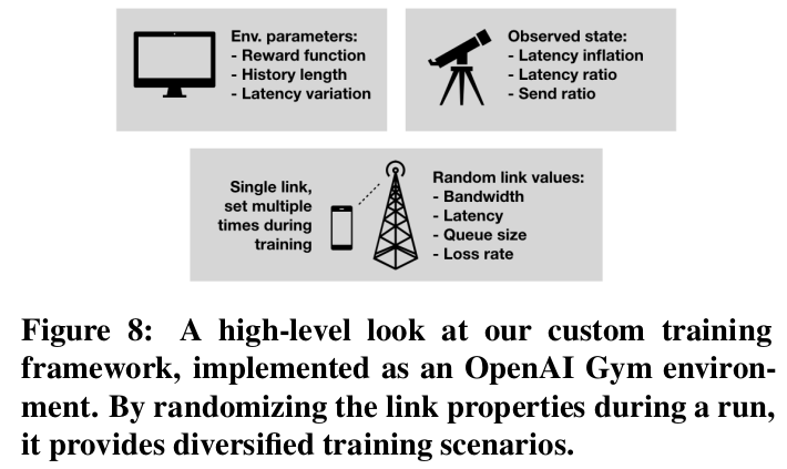 我们的训练框架使用具有不同参数的网络链路上单个流量源的简单模拟。但是,我们训练训练测试组件里远不止这些参数,包括动态的链路而不是纯粹静态的链路,而且是在模拟环境中训练而不仅仅是仿真环境。特别地,我们使用标准的网络研究工具 Mininet(Fontes et al., 2015) 和 Pantheon 平台(Yan et al.,2018)进行各种各样的网络场景的测试,测试模型的性能表现和鲁棒性,并且和最新的拥塞控制协议比较。