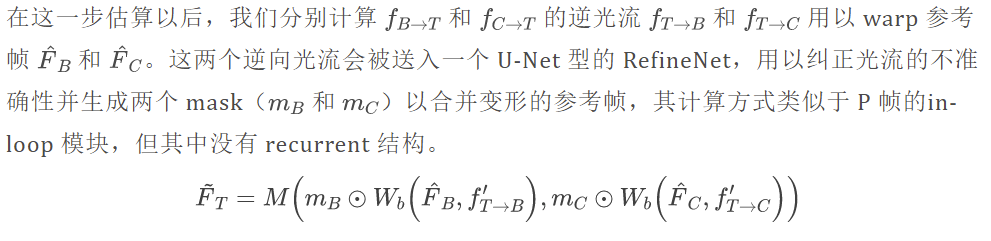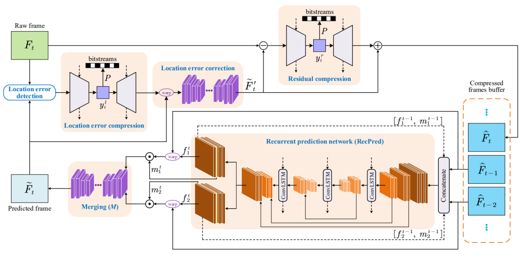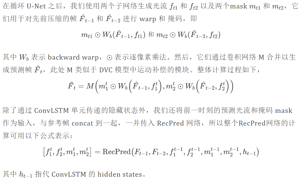 上图所示为P帧的预测模块,在IPPP模式的视频压缩中,P-帧以单向方式连续压缩,因此P帧压缩使用的是单向的 Recurrent in-loop Prediction (RecPred) network,RecPred 网络中使用 U-Net 作为特征提取模块,但我们分别将三个 ConvLSTM 层插入到下采样部分、中间层和上采样部分,这使得 RecPred 网络具有循环性,因此它能够利用连续压缩帧中的时间信息。
