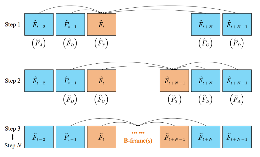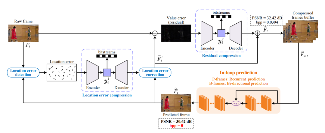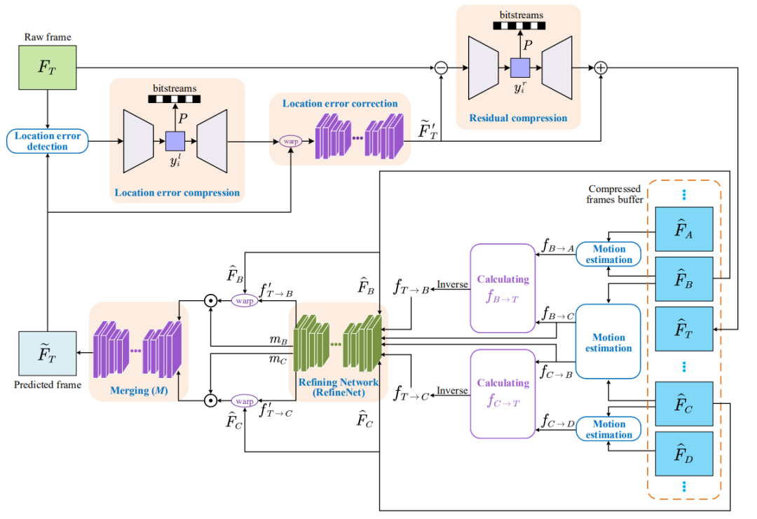 本文基于端到端深度视频压缩框架,提出了一种环路多帧预测模块(in-loop frame prediction module),在不额外消耗码率的情况下,对当前帧实现基于多个参考帧的高效预测。