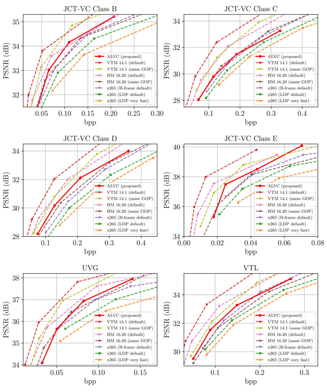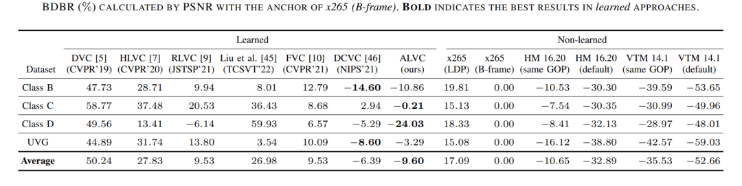 上表展示了与 x265 (B-帧) 为 anchor 计算的 PSNR Bjøntegaard Delta 比特率 (BDBR) 性能(越低越好)。从表中可以看出,我们的 ALVC 方法在所有数据集上优于 DVC、HLVC、RLVC、FVC、x265 (LDP) 和 x265 (B-frame)。我们还在 Class C 和 Class D 上击败了 DCVC,我们的 ALVC 方法的平均 BDBR 比 DCVC 好 3.21%。