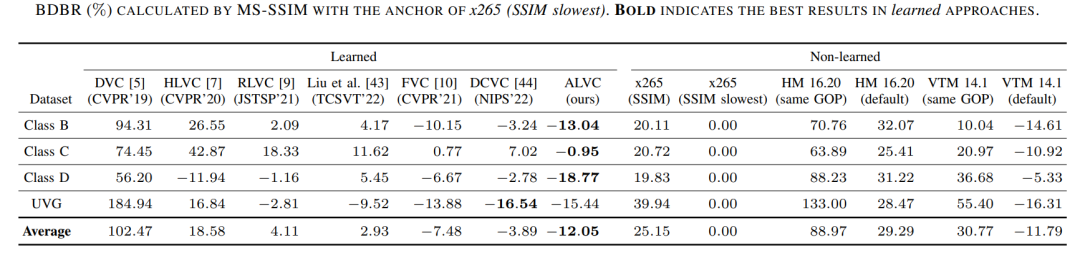 上表展示了基于 MS-SSIM 的 BDBR 性能,以 x265 (SSIM slowest) 的性能作为 anchor。从这个表可以看出,我们的 ALVC 方法在所有数据集上均优于 DVC、HLVC、RLVC、FVC、x265 (SSIM)、x265 (SSIM slowest)、HM 16.20 (same GOP)、HM 16.20 (default) 和 VTM 14.1 (same GOP)。我们还在类别 B、C 和 D 上优于 DCVC。在 UVG 上我们稍逊于 DCVC,但平均 BDBR 超过 DCVC 8%。