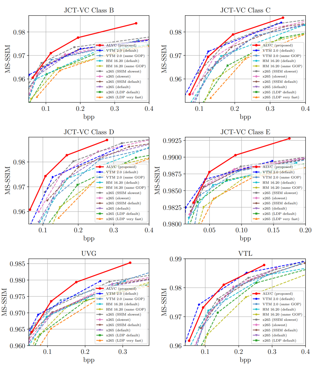 上图说明,尽管我们在深度学习方法中实现了最先进的性能,但我们的 ALVC 无法赶上 HM 16.20 (default)、VTM 14.1 (same GOP) 和 VTM 14.1 (default) 的性能。