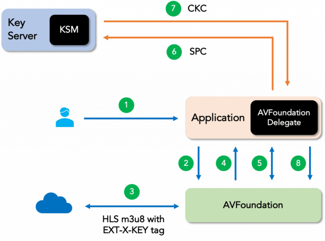 第4步:AVFoundation在m3u8中搜索#EXT-X-KEY,以检查视频是否被加密。如果内容已被加密,AVFoundation将向AVFoundation App Delegate请求内容密钥并解密内容。
