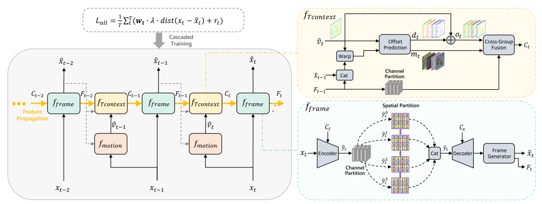 如图所示,整个运动补偿由两个核心子模块组成:偏移预测和交叉分组融合。首先,偏移预测使用解码的 MV 来预测残差偏移 dt,其中 xt-1 和 Ft-1 也被 warp 并用作辅助信息,dt 加上基础偏移 MV 成为最终偏移 ot。同时,偏移预测还生成调制掩码 mt,可以看作是反映偏移置信度的注意力权重图。值得注意的是, Ft-1 沿通道维度被分为 G 组,每组有单独的 N 个偏移。因此,总共有 G×N 个偏移可学习。多样的偏移互补,有助于编解码器处理复杂的运动和遮挡。