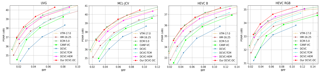 DCVC-DC相对于VTM平均可节约17.0%的码率。仅考虑Y分量时,相对于VTM平均可实现15.3%的码率节约。平均而言,DCVC-DC 在 YUV420 方面同样优于ECM。